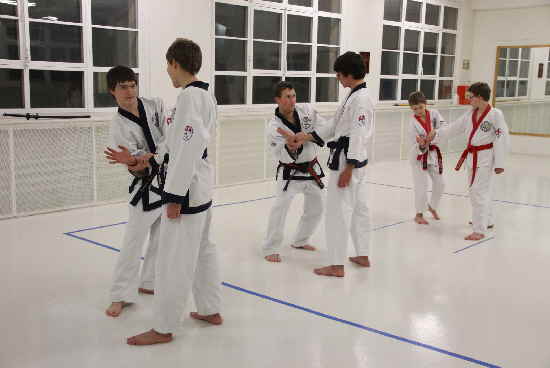 Sa Bom Nim Fabian Markl übt während dem Mittwochstraining zusammen mit den Dans und Rotgurten Selbstverteidigungstechniken.
