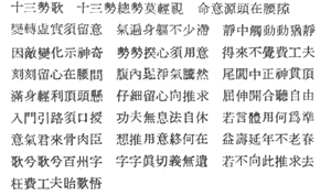 Vernachlässige nie irgendeines von den Sip Sam Seh. Die Quelle des Willens ist in der Hüfte. Beachte die kleinste Änderung von voll zu leer. Lass die Energie fortlaufend durch den Körper fliessen. Innere Ruhe bedeutet Bewegung. Bewegung bedeutet innere Ruhe. Suche die innere Ruhe in der Bewegung.